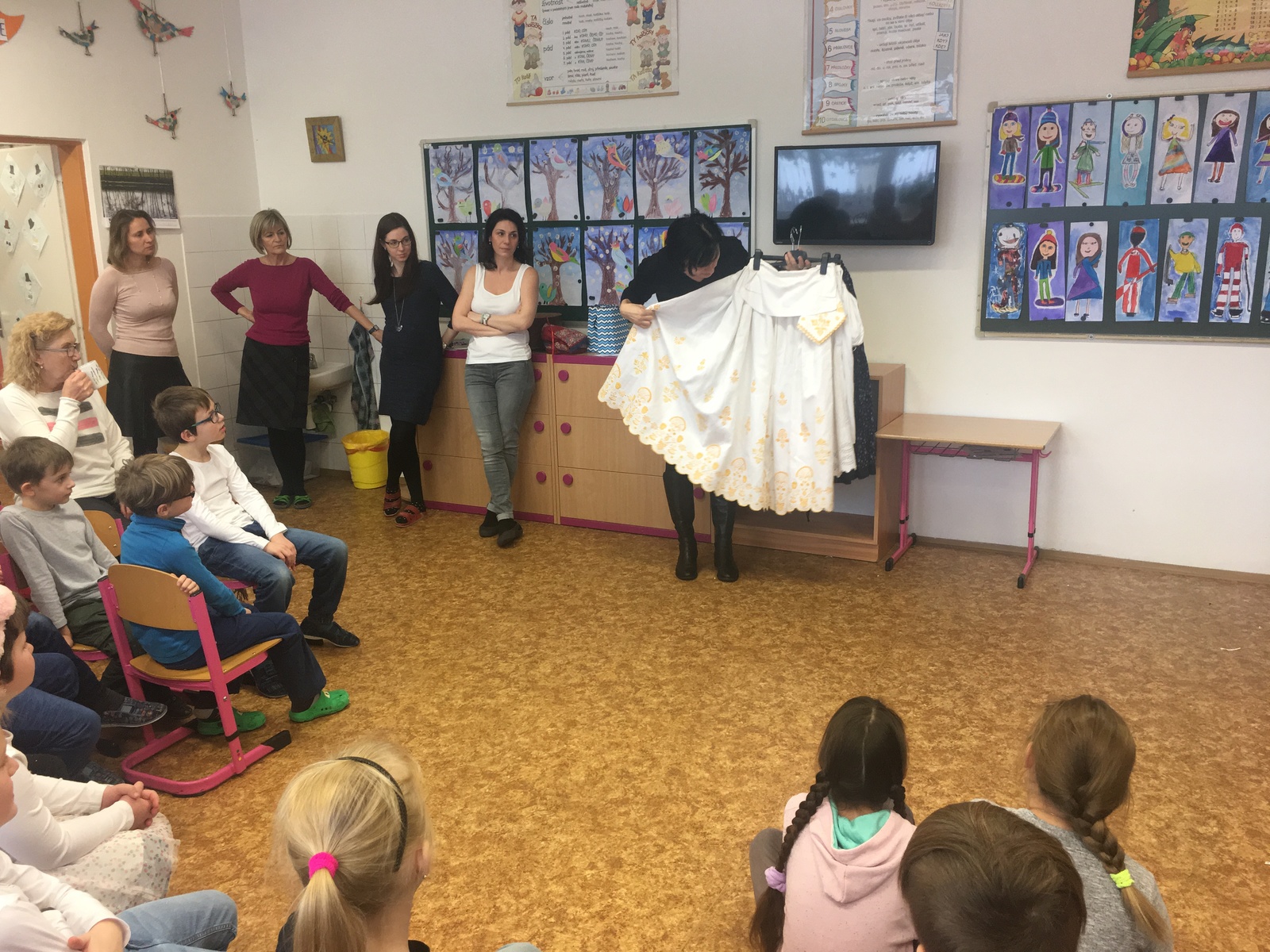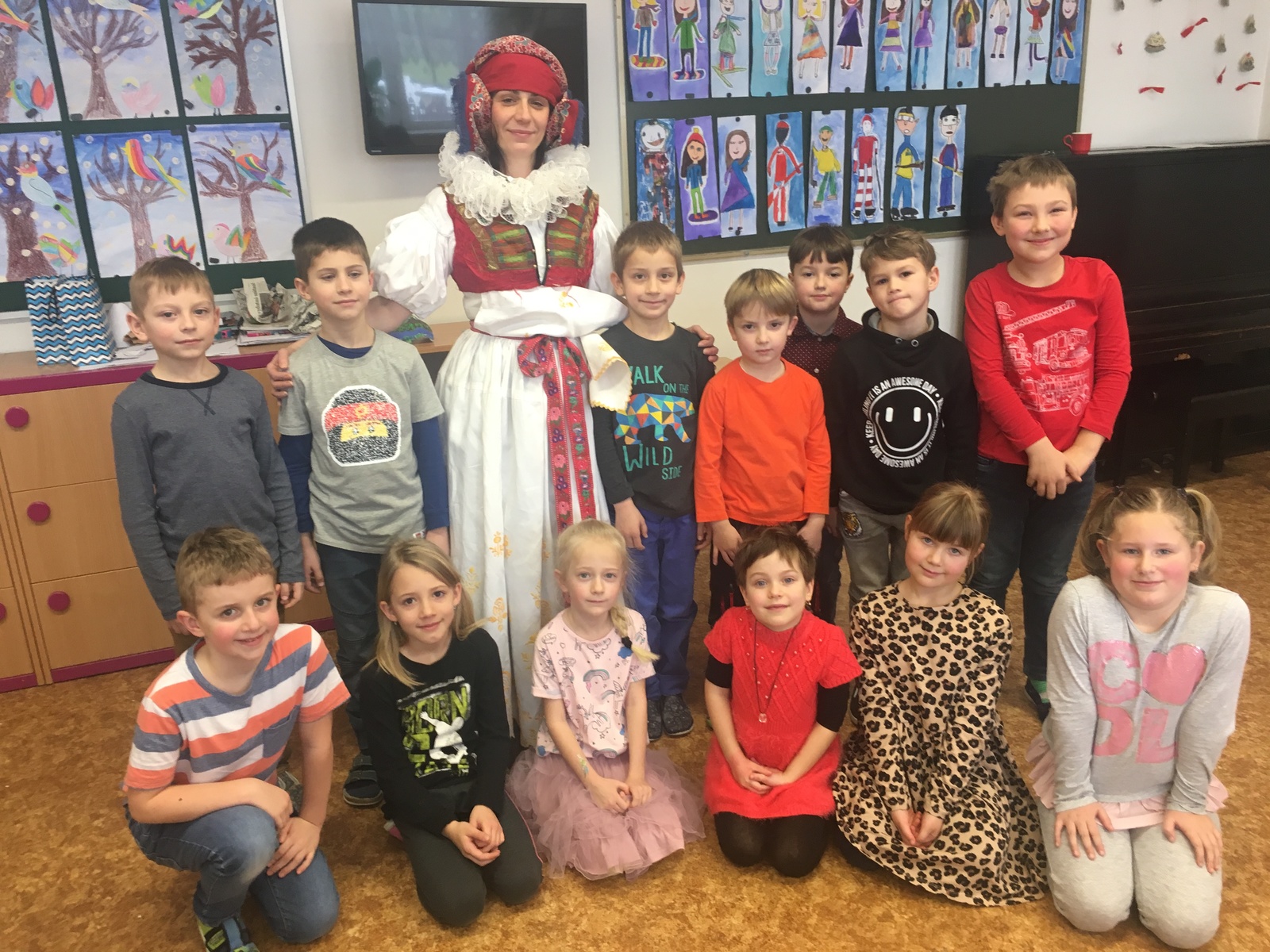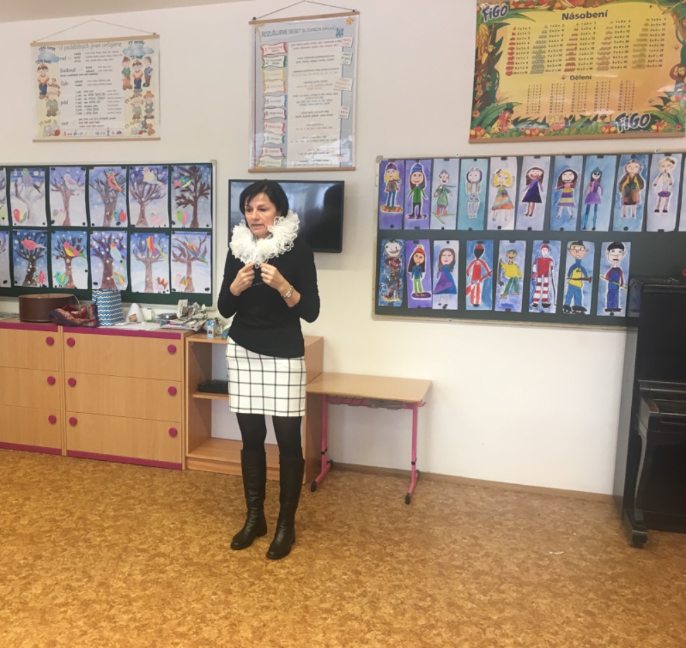Dne 31. 1. si děti neodnesly ze školy jen výsledek své půlroční práce v podobě pololetního vysvědčení, ale i zážitek z předvedení pravého hanáckého kroje. Paní učitelka Vybíralová z naší MŠ byla tak laskavá a přivezla do školy svůj vlastní, již cenný kroj. Dětem povyprávěla o jeho původu a stáří a naší paní asistentku do něj nastrojila. Díky této ukázce se rozvinula debata o tradicích, paličkování a také hrdosti na to, odkud pocházíme.