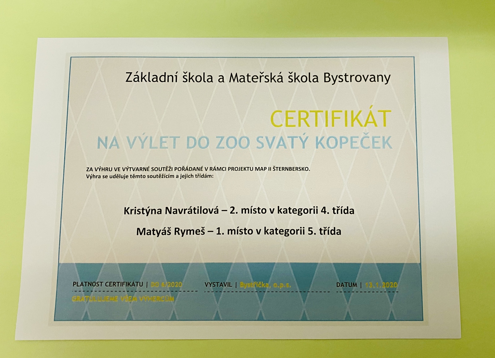 Velmi úspěšní byli ve výtvarné soutěži, kterou vyhlásila MAS Bystřička v rámci projektu Místní akční plán rozvoje vzdělávání v SO ORP Šternberk II, dva žáci 4. a 5. ročníku - K. Navrátilová a M. Rymeš.