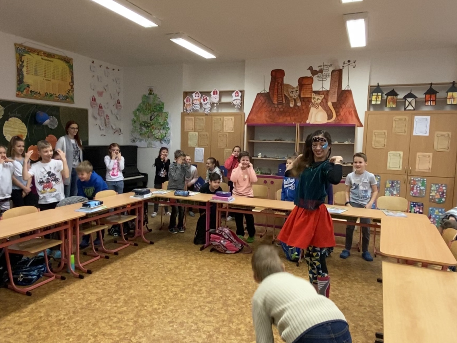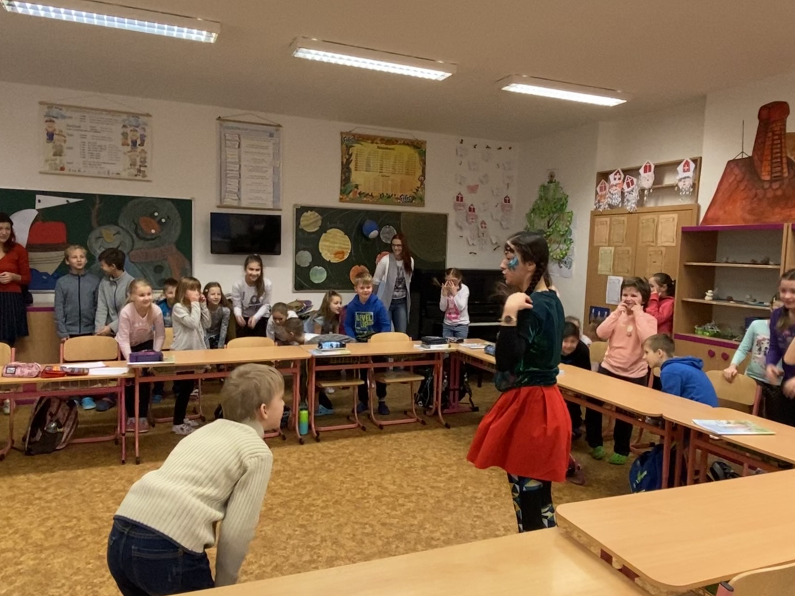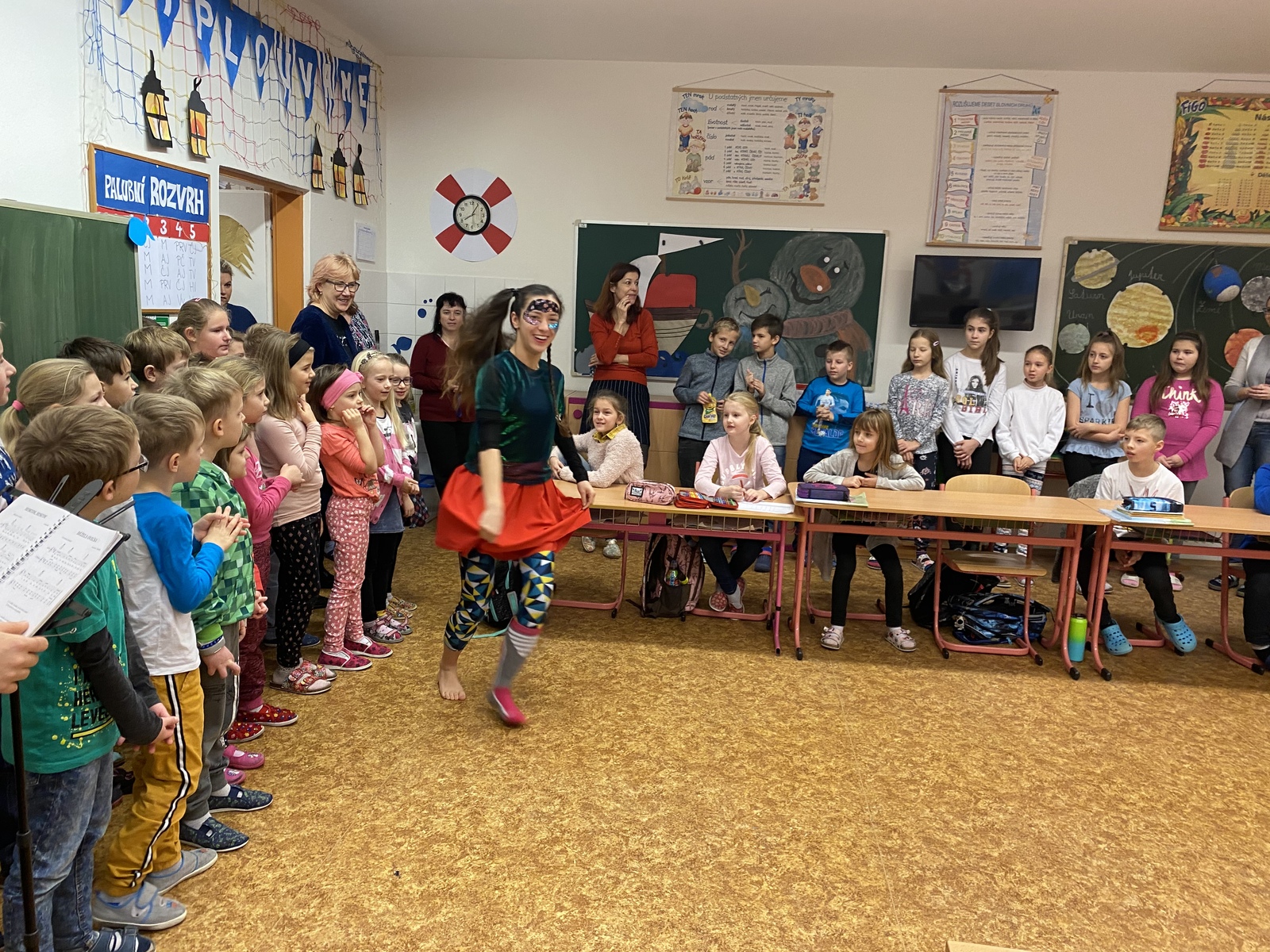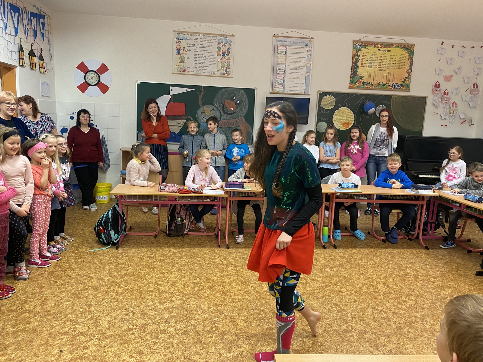 Hned po ranním zpívání mezi děti vběhla paní CHYBA. Byla rozverná, děti i rozpohybovala, rozesmála a určitě nevzbuzovala strach a obavy. Ve třídách poté proběhly diskuze na téma, že když se člověk něčemu učí, je chyba přirozený jev :-).