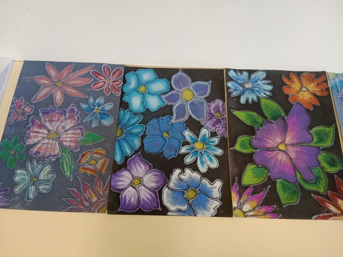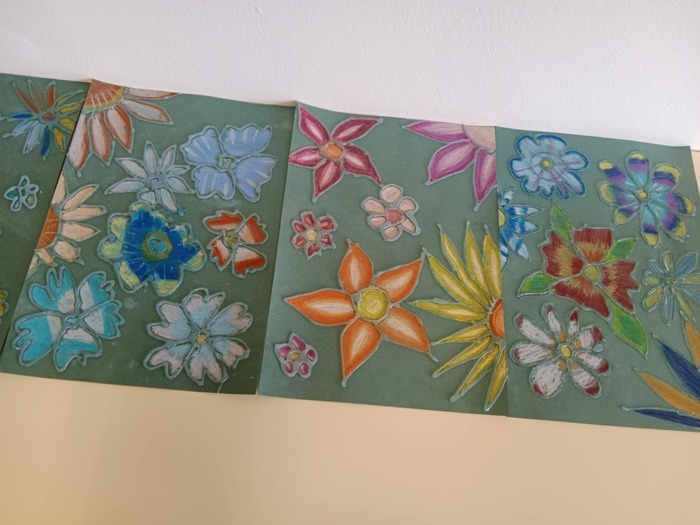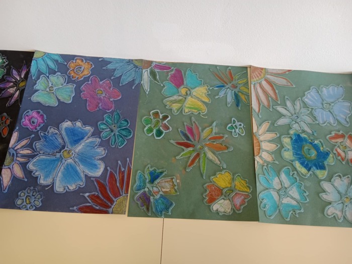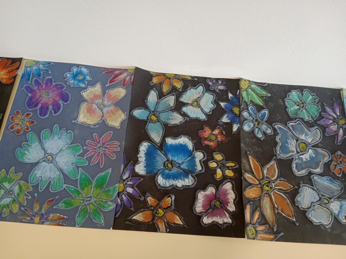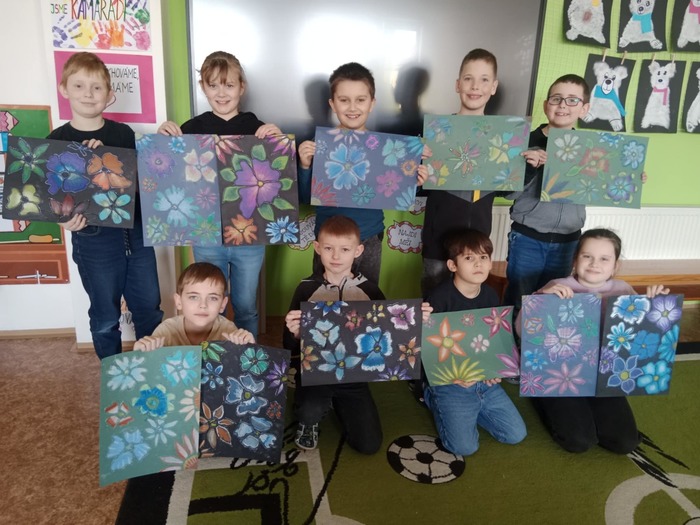 Na výtvarném projektu pracovali žáci druhého a třetího ročníku. Pod vedením svých učitelek si vyzkoušeli speciální techniku použití tavné pistole a olejového pastelu, která je nejen zaujala, ale také rozvíjela jejich tvořivost a jemnou motoriku. Nejprve žáci pomocí tavné pistole vytvářeli jednoduché obrysy květin, po zaschnutí lepidla pak výkresy rozjasnili olejovými pastely.
