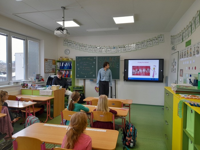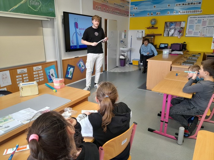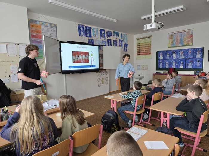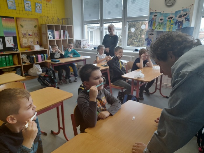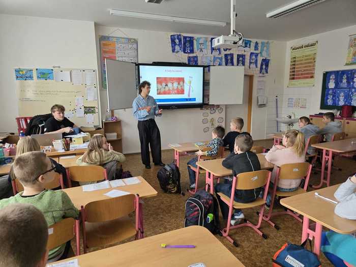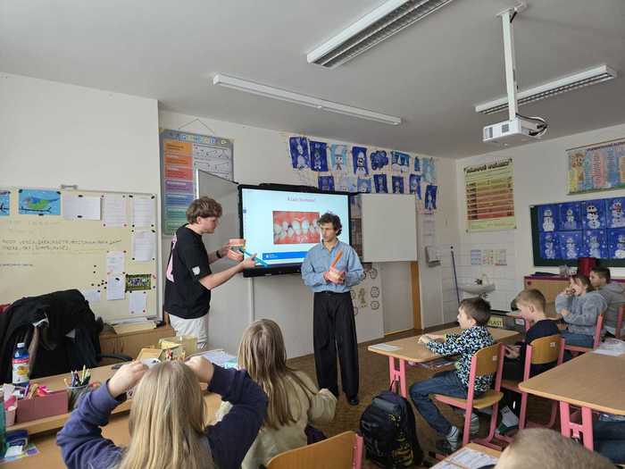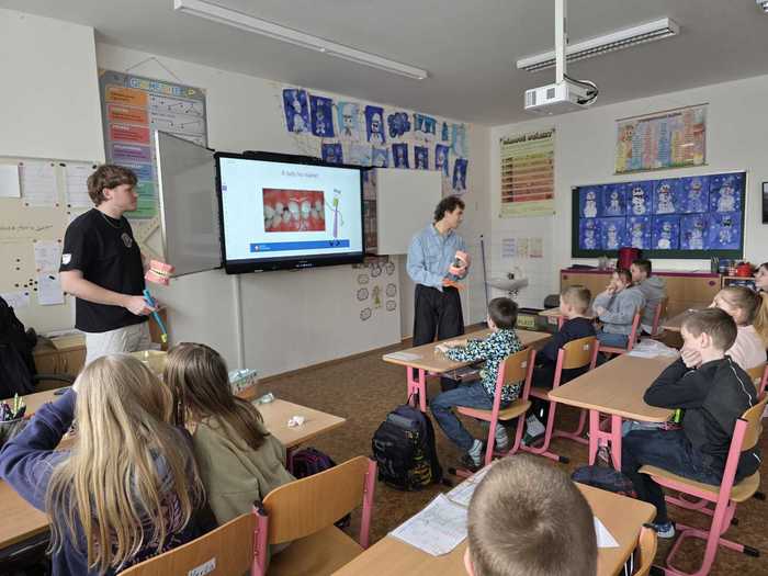 Naši školu navštívili dva odvážní mladí zubaři z Lékařské fakulty v Olomouci, aby žákům představili zásady správné hygieny dutiny ústní. Program probíhal v průběhu celého dopoledne napříč všemi třídami.