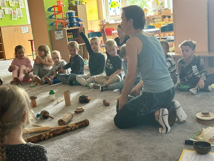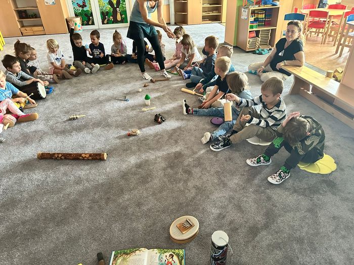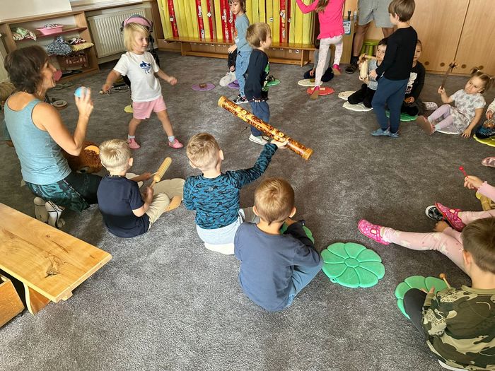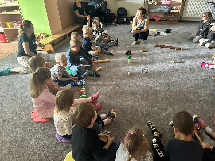 V úterý 30.9.2025 jsem si ve školce užili krásné muzikohrátky. Lektorka si pro děti připravila pohádku O lvovi a myšce, která byla doprovázena hrou na netradiční hudební nástroje. Děti se nejen pobavily příběhem, ale také měly možnost seznámit se s různými nástroji. Společně si vyzkoušely, jak znějí a co jim zvuk připomíná. Celé setkání bylo zaměřené na procvičování smyslového vnímání, relaxaci a zároveň rozvíjely svou fantazii při poslechu příběhu.