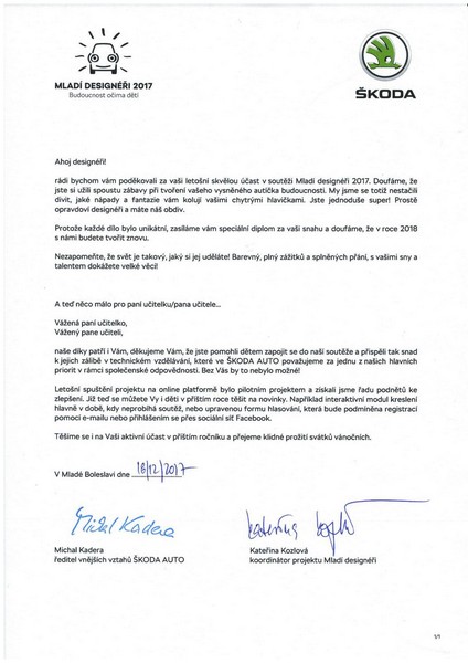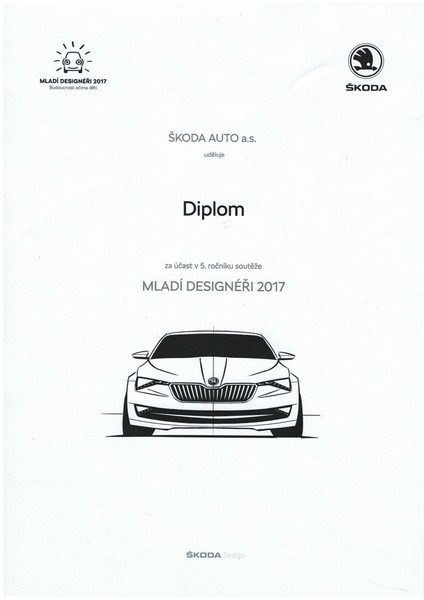 Automobilka Škoda Mladá Boleslav vyhlásila další ročník soutěže Mladí designéři. Děti měly za úkol navrhnout a vytvořit auto budoucnosti. V rámci školní družiny jsme se s dětmi rozhodli soutěže zúčastnit. Vytvořili jsme celkem čtyři návrhy, dva z nich byly vyrobeny z recyklovatelných materiálů (pet vršky a karton z krabic). Další auto bylo určeno dámám na cesty a mladší děti vymyslely auta na ruční pohon.